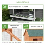 - Tvirta konstrukcija: ši itin didelė vištidė pagaminta iš tvirtos eglės ir padengta oro sąlygoms atspariais dažais. UV atsparus vandeniui atsparus stogas užtikrina optimalią apsaugą nuo elementų. Tvirta konstrukcija palaiko jūsų gyvūnų gerovę ir sveikatą.