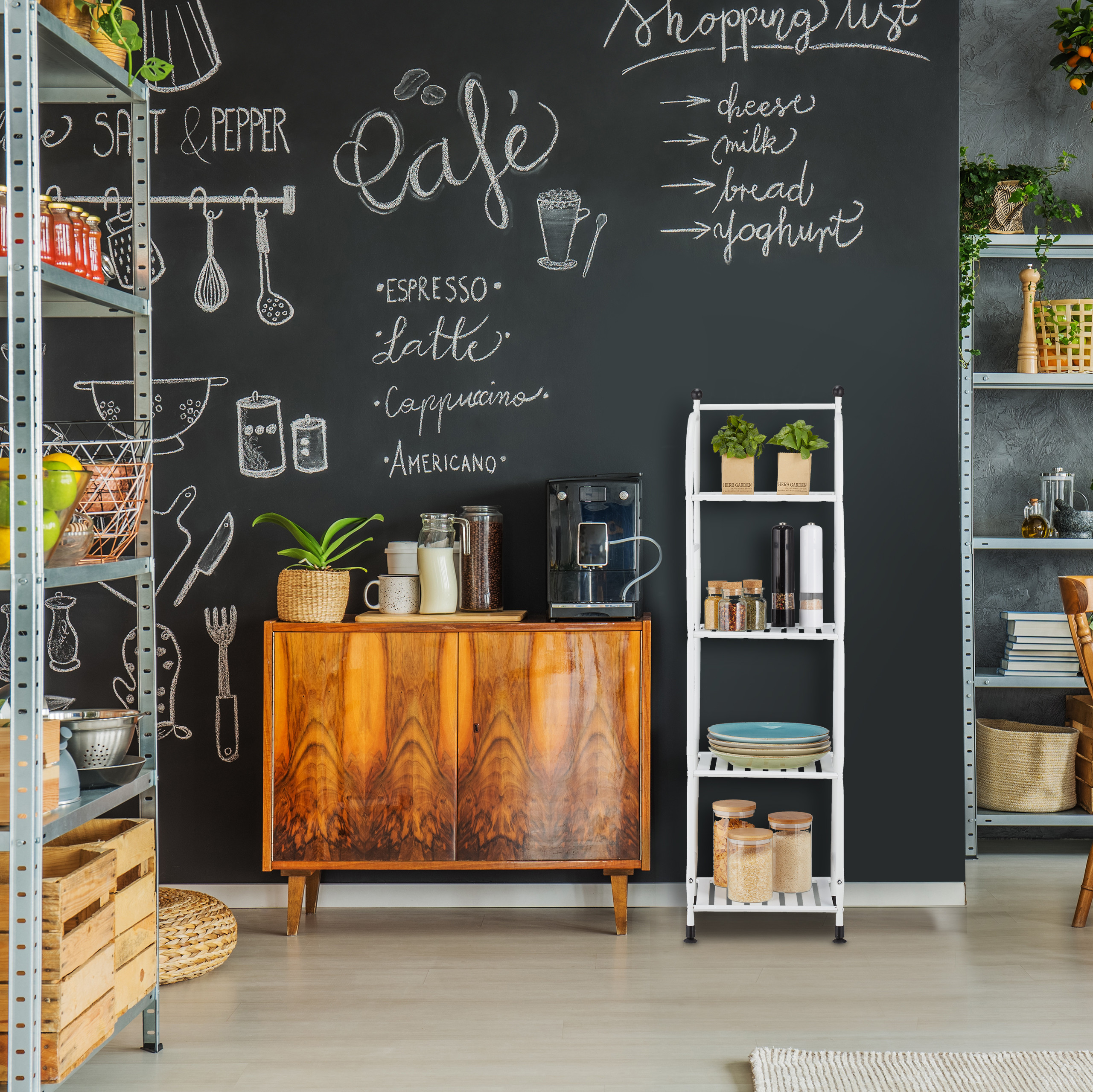 - 4 Lygiai: Pakankamai vietos rankšluosčiams, kosmetikos reikmenims, virtuvės reikmenims ar net dekoracijoms ir augalams.