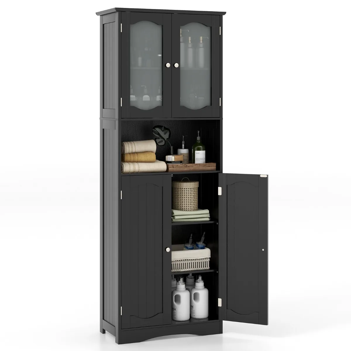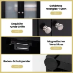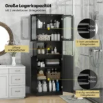 Vonios lentyna 60x30x164cm juodos spalvos yra praktiškas sprendimas vonios kambario erdvės tvarkai palaikyti. Ši aukšta spintelė su matiniu grūdinto stiklo durimis ir reguliuojamomis lentynomis suteikia patogią vietą higienos reikmenims ir rankšluosčiams laikyti.