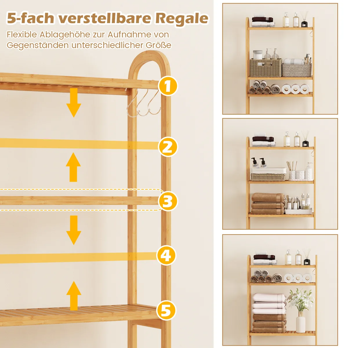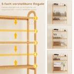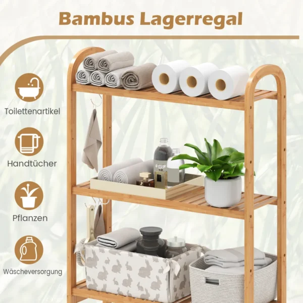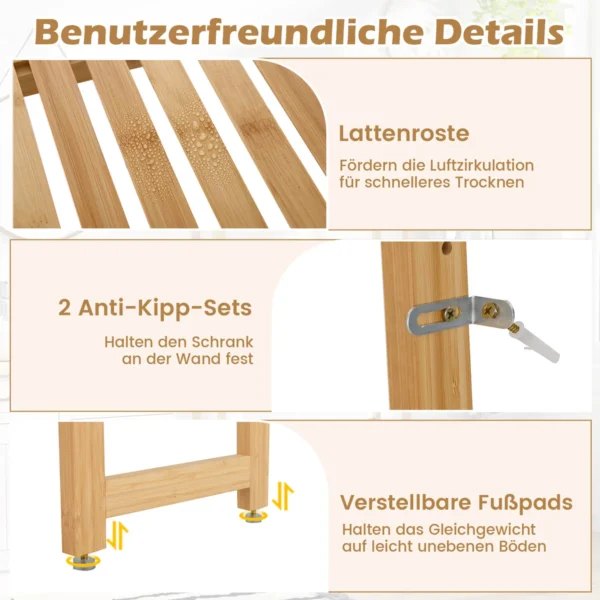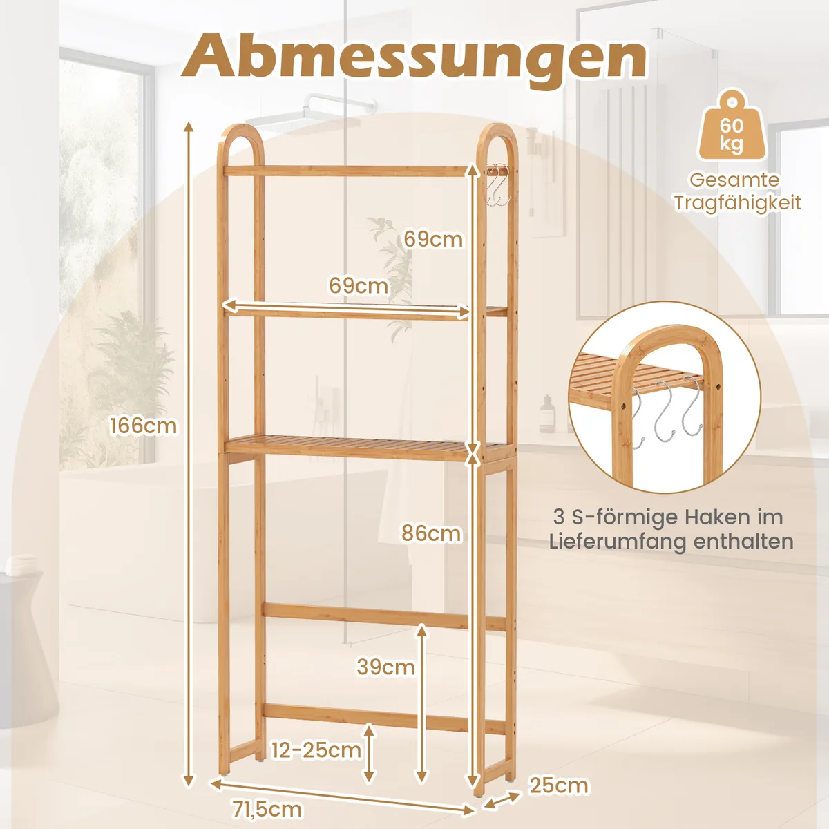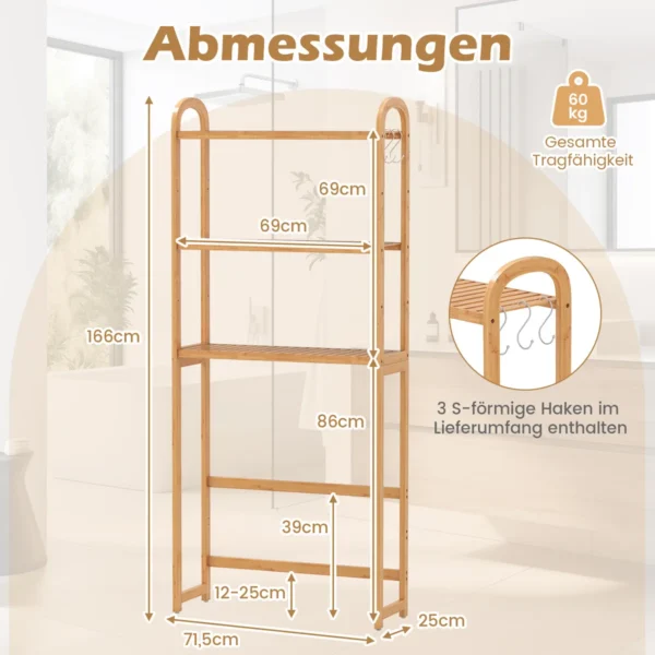 Vonios lentyna 71,5x25x166 cm šviesiai rudos spalvos yra praktiškas sprendimas vonios kambariui, kuriame trūksta vietos. Ši bambukinė lentyna suteikia išmanią saugyklą su trims reguliuojamomis lentynomis ir kabliukais, tinkama montuoti virš unitazo.