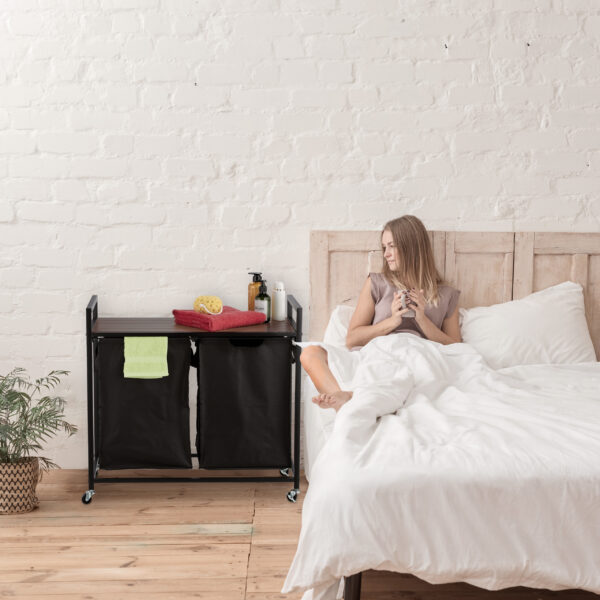 - Pramoninis Dizainas: Šis praktiškas skalbinių rūšiuotojo ir vonios lentynos derinys taps stilingu akcentu jūsų miegamajame ar vonios kambaryje.