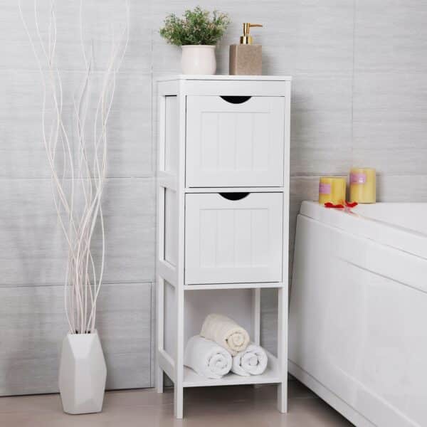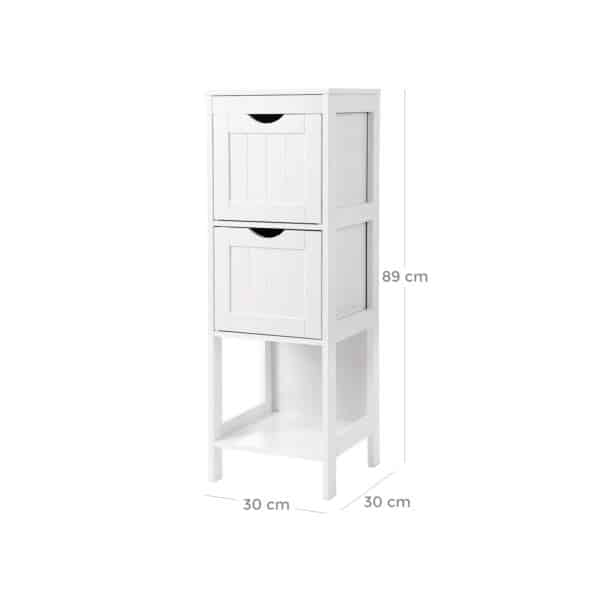 Ši vonios lentyna su 2 stalčiais, baltos spalvos, yra puikus sprendimas jūsų vonios kambariui. Pagaminta iš aukštos kokybės medžio dulkių plokštė (MDF)s, ji ne tik atrodo elegantiškai, bet ir yra itin patvari.
