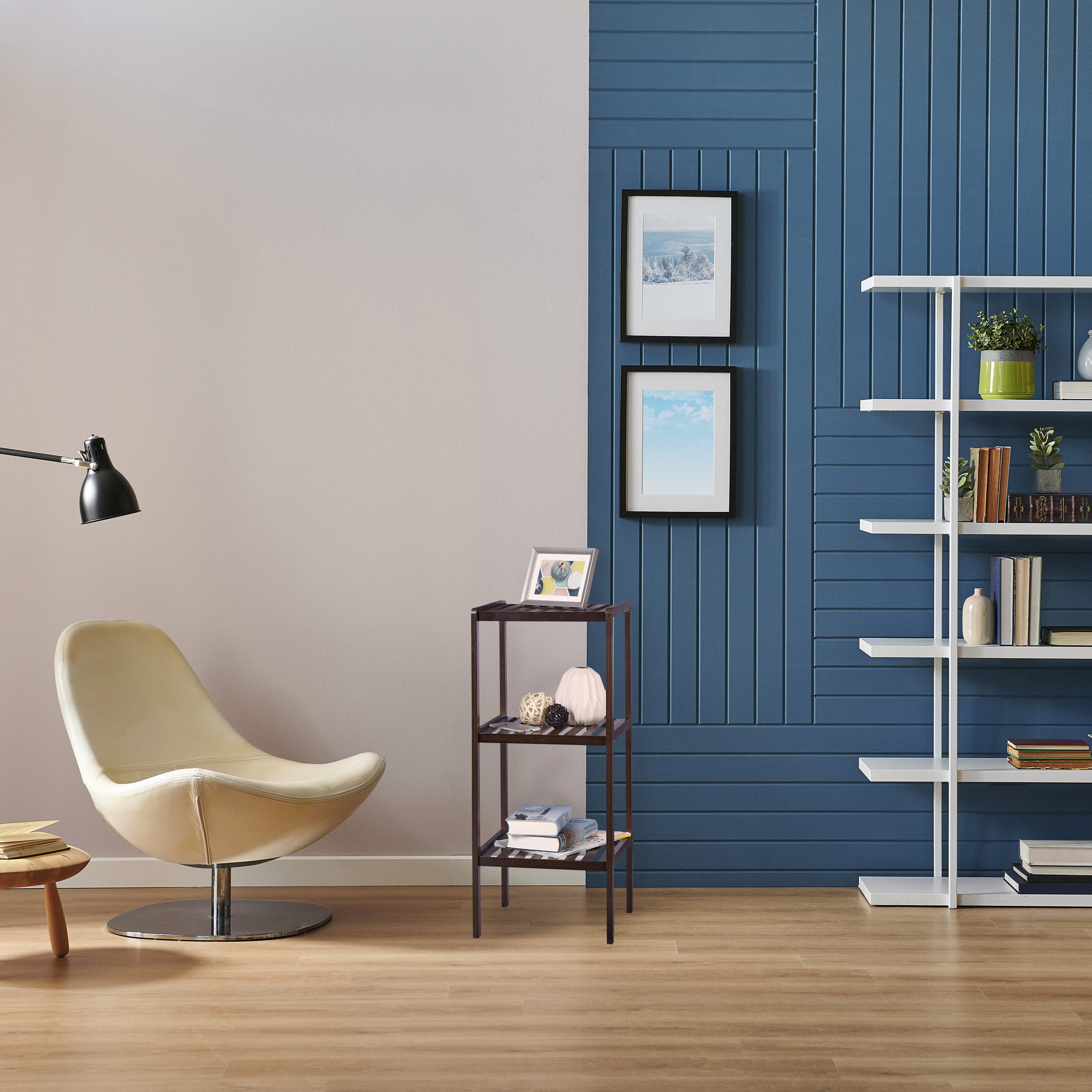 - Dizainas: Trys kvadratinės lentynos, kurios suteikia pakankamai vietos įvairiems daiktams laikyti.