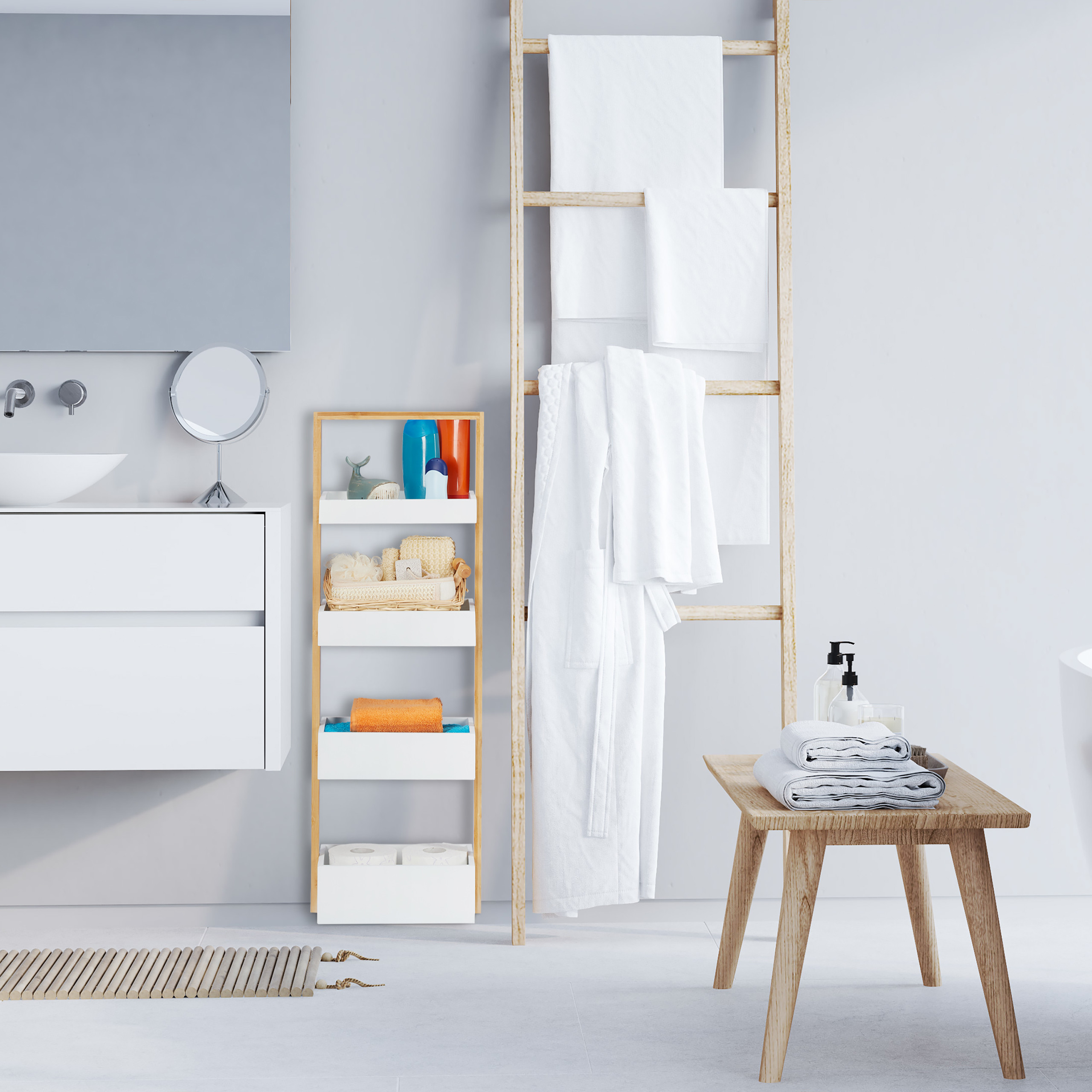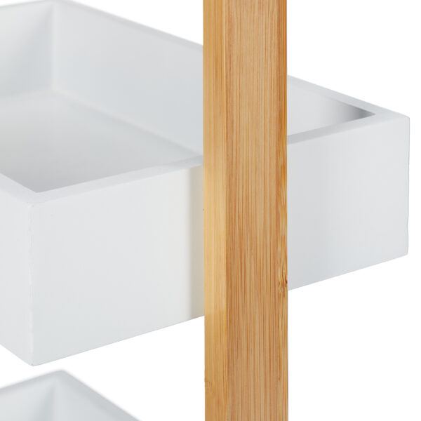 Šviesiai rudos ir baltos spalvos derinys suteikia lentynai elegancijos ir šilumos, o bambukinė konstrukcija užtikrina ilgaamžiškumą ir tvarumą. Pasirinkite šią vonios lentyną ir suteikite savo namams daugiau tvarkos ir stiliaus.