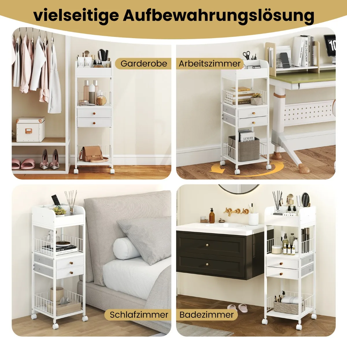 - Ratukai su dviem užrakinamais stabdžiais suteikia galimybę lengvai perkelti lentyną ir pritvirtinti ją pageidaujamoje vietoje.