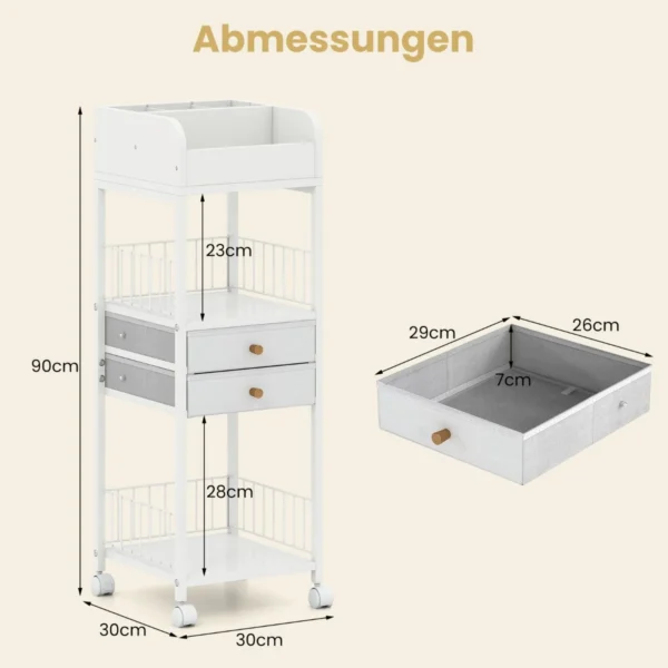 Vonios lentyna su ratukais 30x30x90 cm, baltos spalvos, – patogus ir funkcionalus sprendimas kosmetikos, odos priežiūros priemonių ir kitų grožio produktų laikymui. Dėl mobilumo ir įvairių skyrių ši lentyna padeda palaikyti tvarką vonios kambaryje ar kitose namų patalpose.