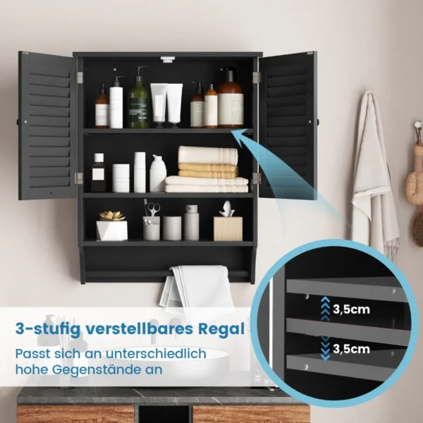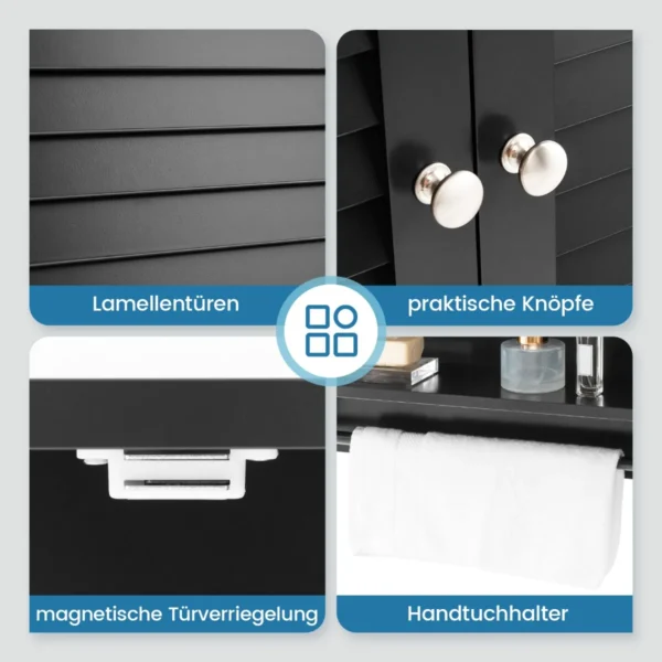 Vonios sieninė spintelė 60x22x75cm juodos spalvos padeda efektyviai sutvarkyti vonios kambario erdvę ir suteikia patogias saugojimo galimybes. Spintelė pritaikyta įvairių vonios reikmenų laikymui, derinama su kitais namų interjero elementais.