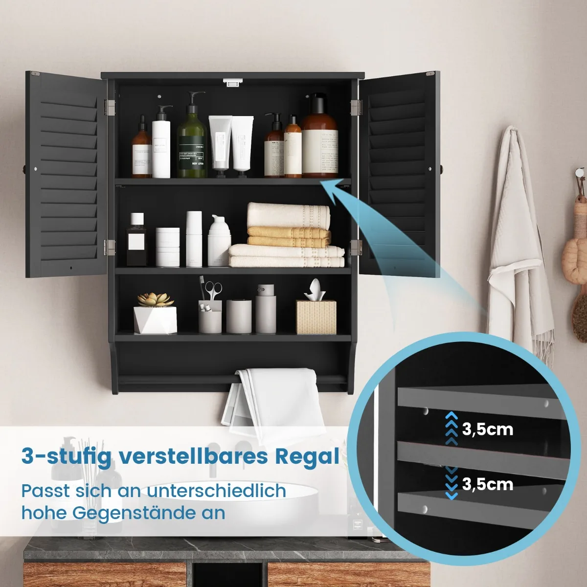 - Spintelėje yra keli saugojimo skyreliai: uždara 2 lygių spintelė, atviras skyrius ir rankšluosčių juosta.