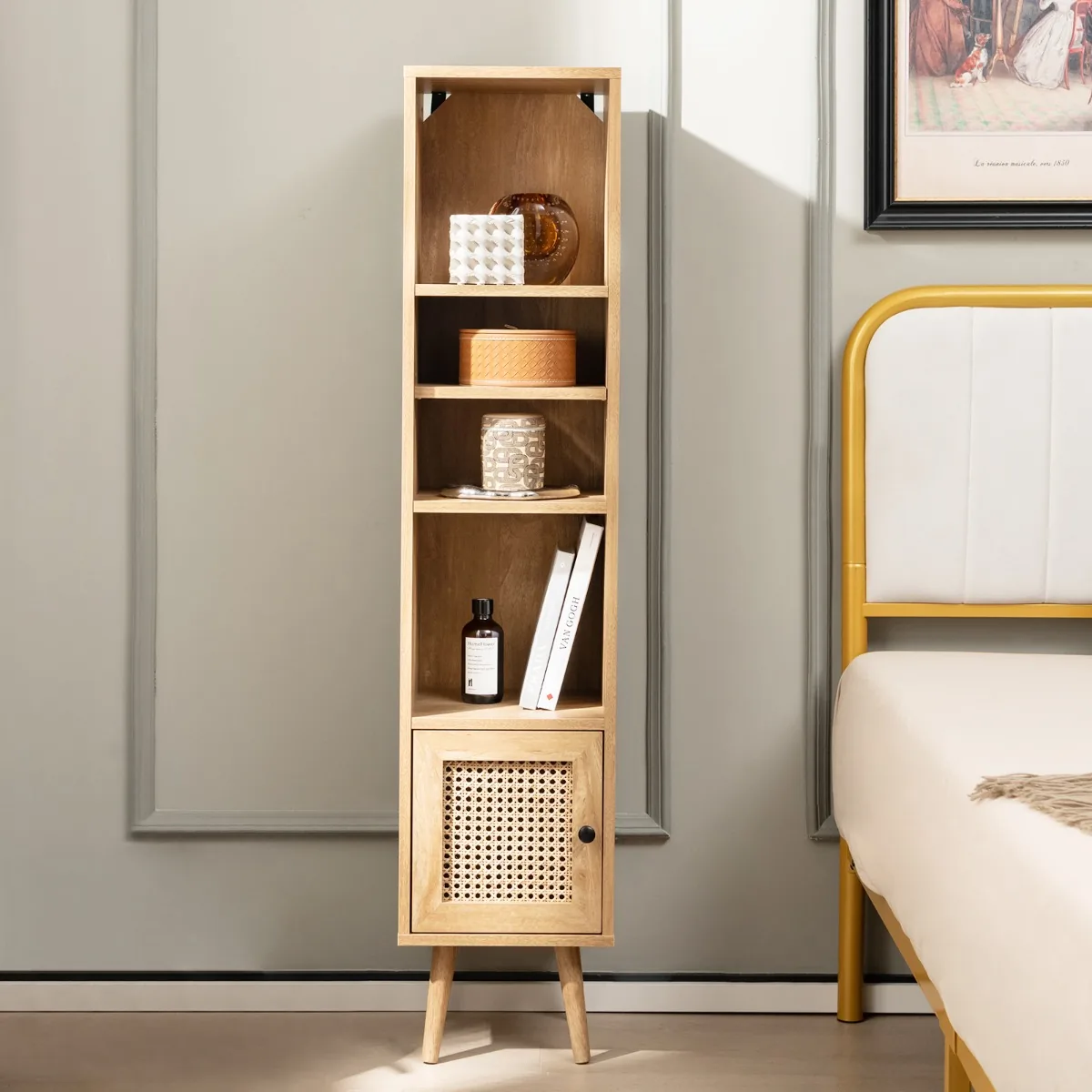• Spintelė su natūralios medienos konstrukcija ir austomis rotango durimis, kurios užtikrina gerą vėdinimą.