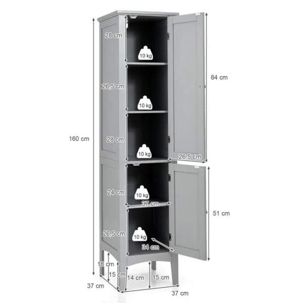 Vonios spintelė 37x37x160cm pilkos spalvos – praktiškas ir kompaktiškas sprendimas jūsų vonios kambariui. Ši aukšta spintelė pagaminta iš atsparaus MDF, pasižymi patvarumu ir lengvu valymu, todėl puikiai tinka drėgnoms patalpoms.