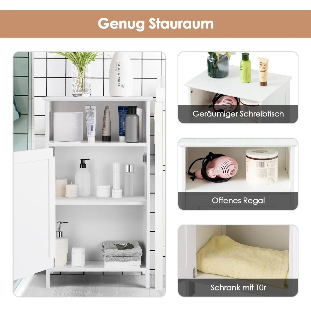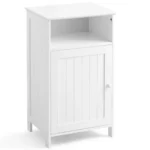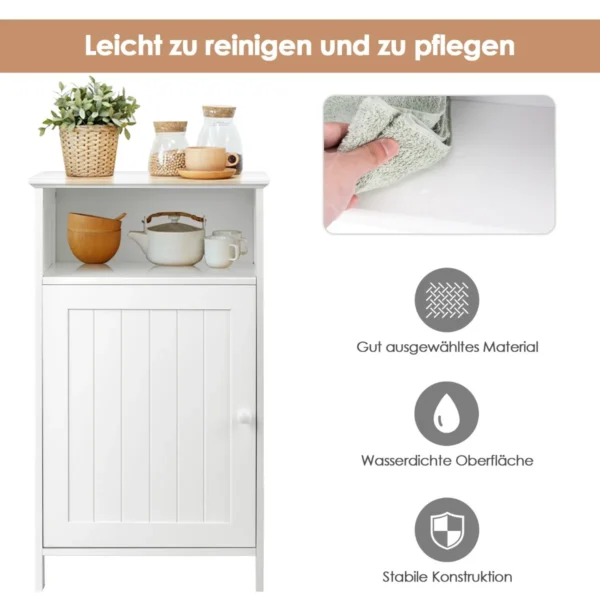 - Grindų spintelė su uždara ir atvira erdve, tinkama daiktų laikymui.