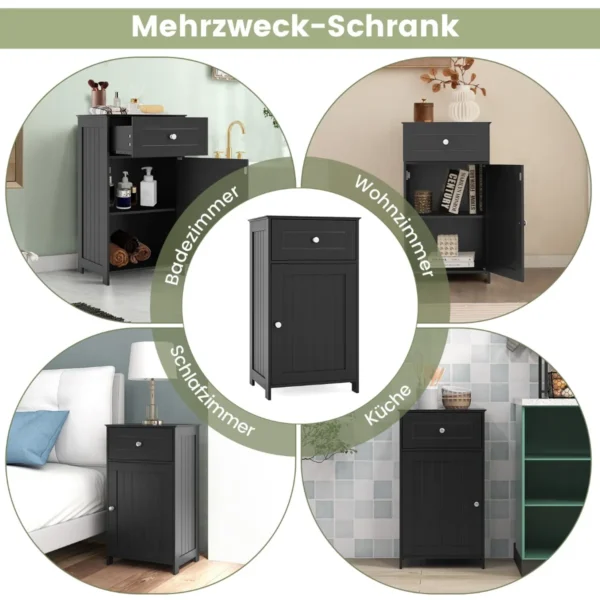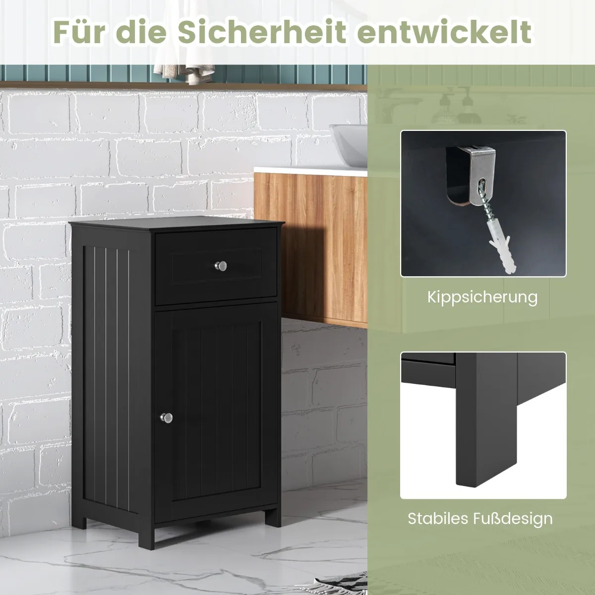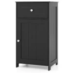 - Spintelė ant grindų, su viena durelė ir vienu dideliu stalčiumi, suteikia pakankamai vietos vonios reikmenims laikyti.