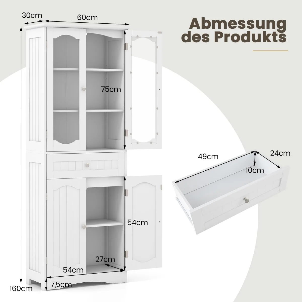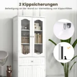 Vonios spintelė 60x30x160cm, baltos spalvos, yra praktiškas sprendimas vonios kambariui ar kitoms namų erdvėms. Dėka grūdinto matinio stiklo durų ir kelių lentynų, ši aukšta spintelė užtikrina patogų ir tvarkingą daiktų laikymą.