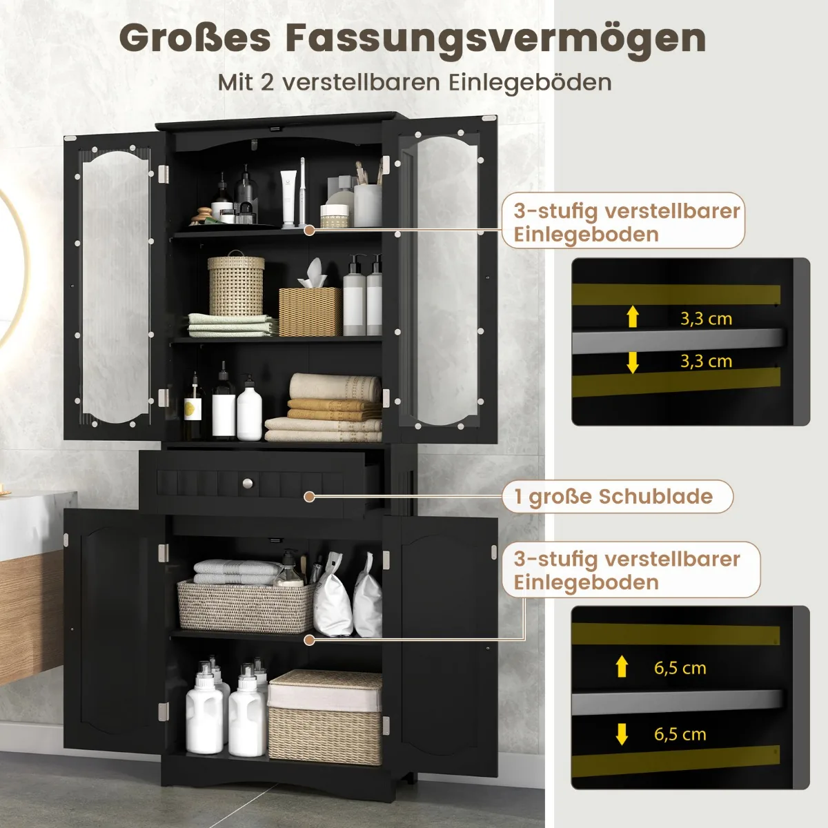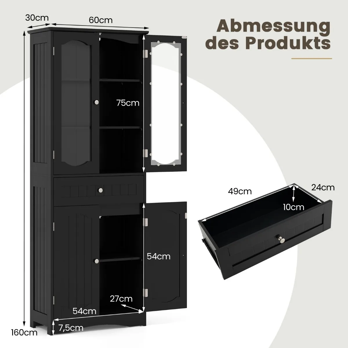 Vonios spintelė 60x30x160 cm juodos spalvos – praktiškas ir funkcionalus sprendimas jūsų vonios kambariui. Ši aukšta spintelė su grūdinto matinio stiklo durelėmis leidžia patogiai laikyti higienos reikmenis, rankšluosčius ir kitus vonios aksesuarus.