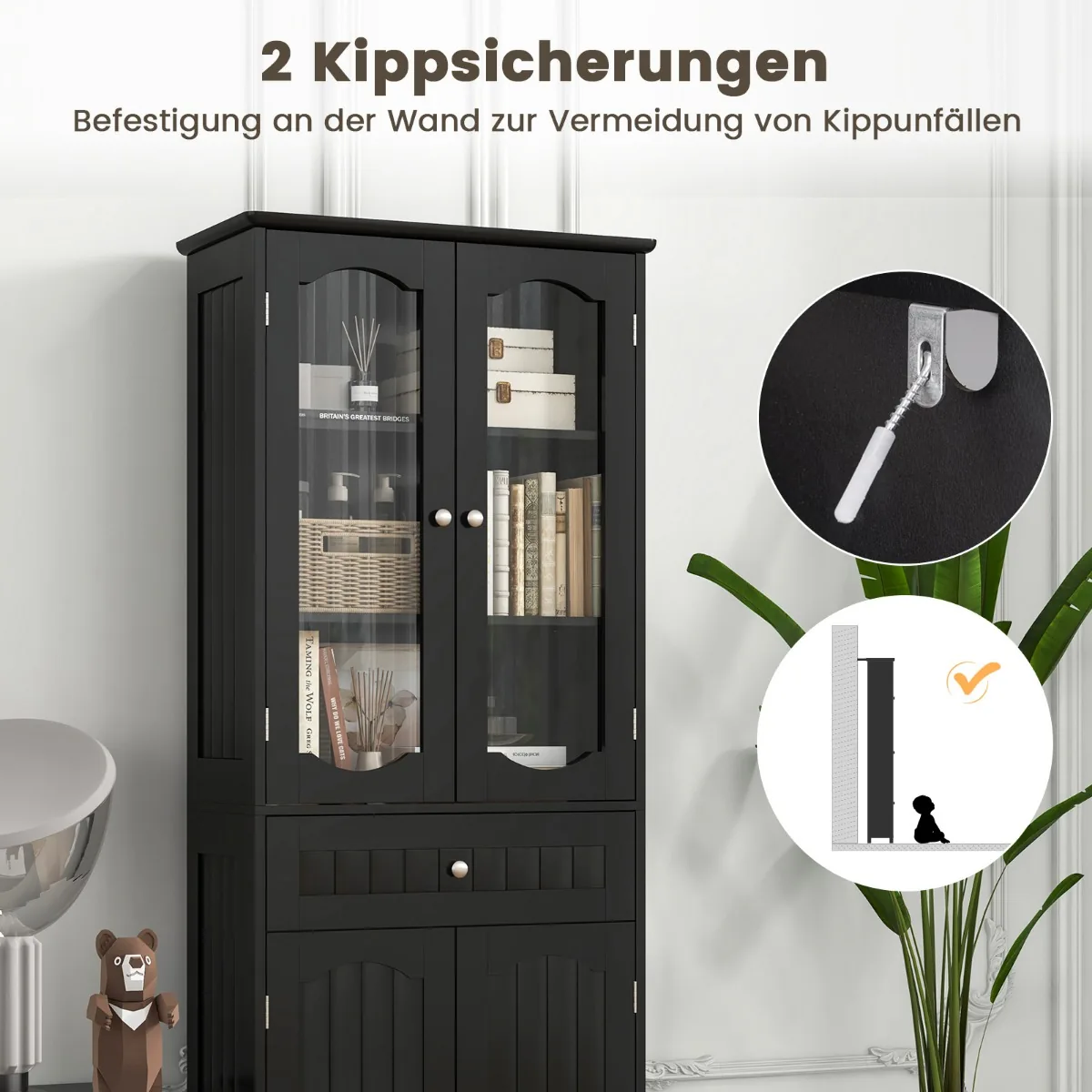 - Aukšta vonios spintelė su dviem grūdinto matinio stiklo durimis suteikia privatumo ir organizuotumo.