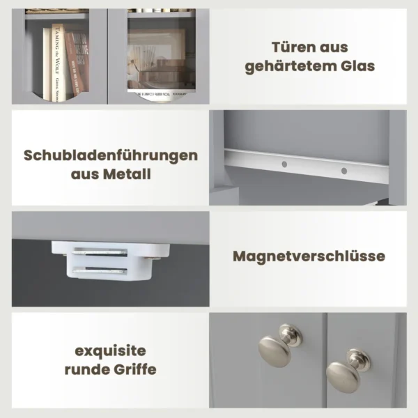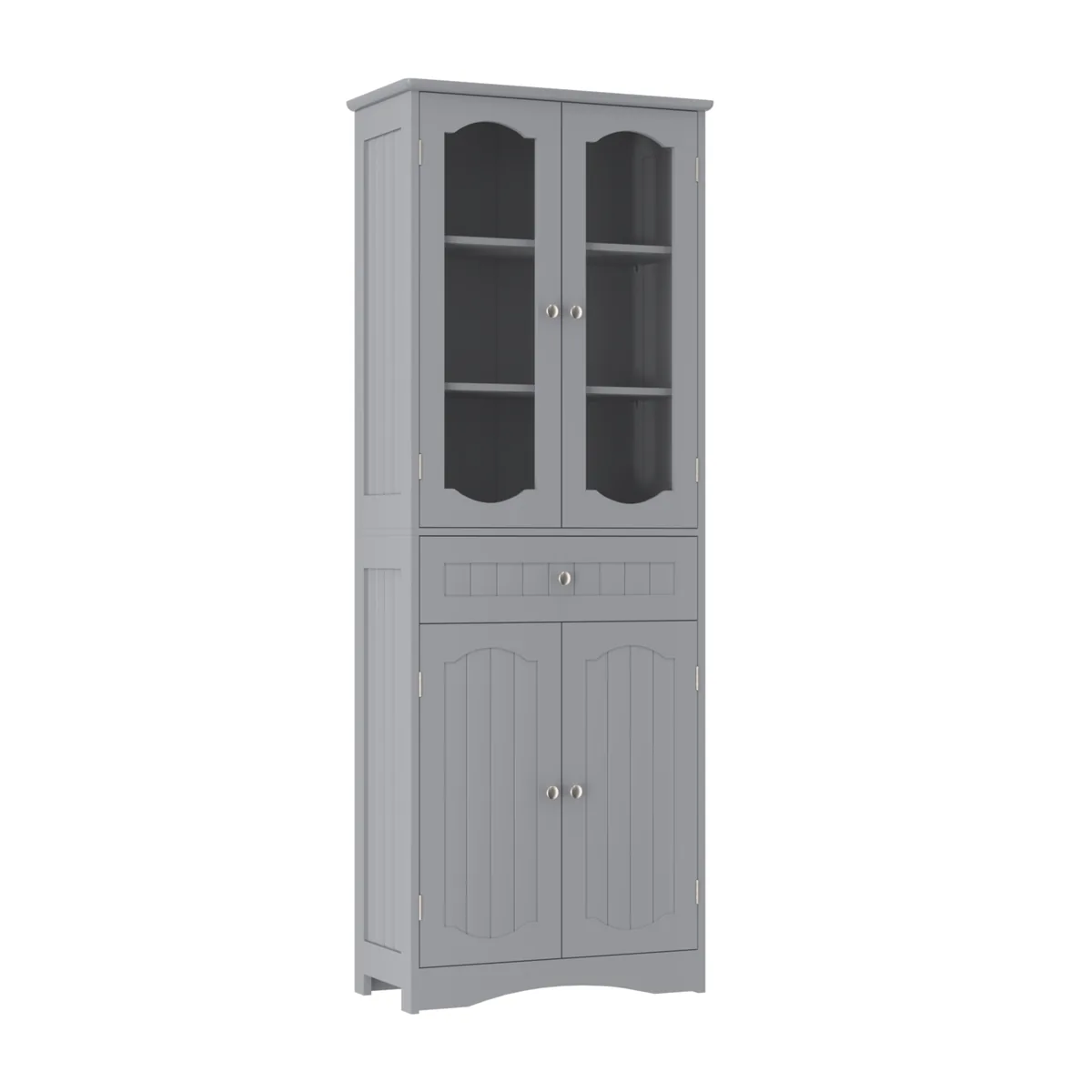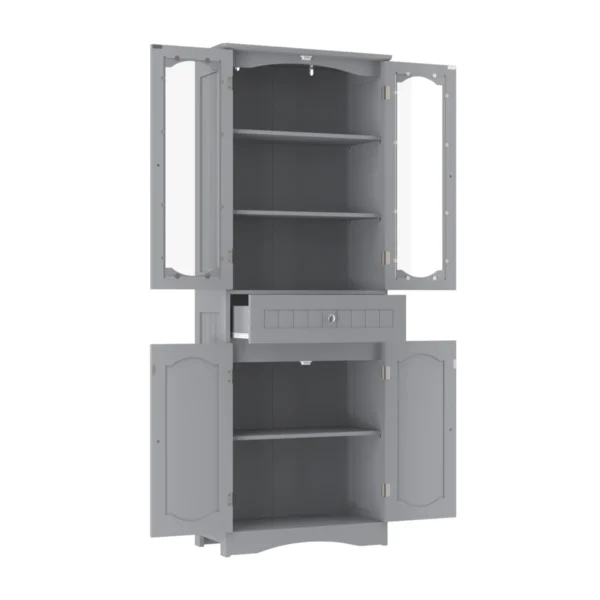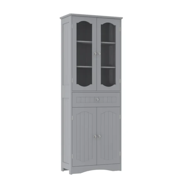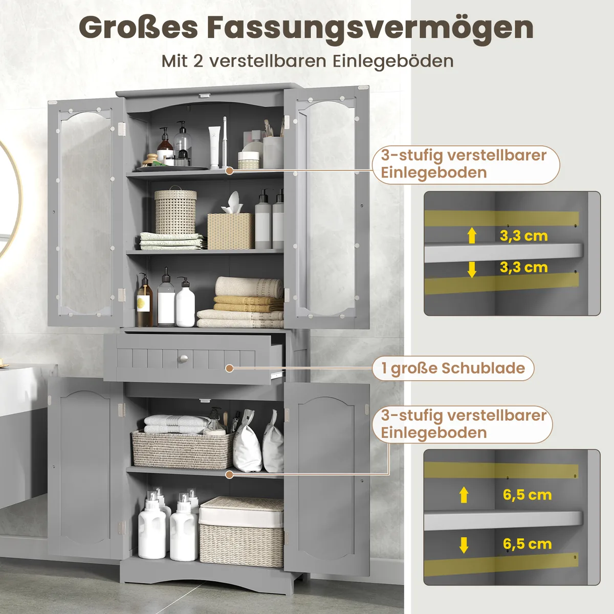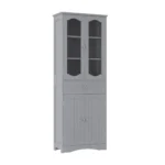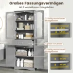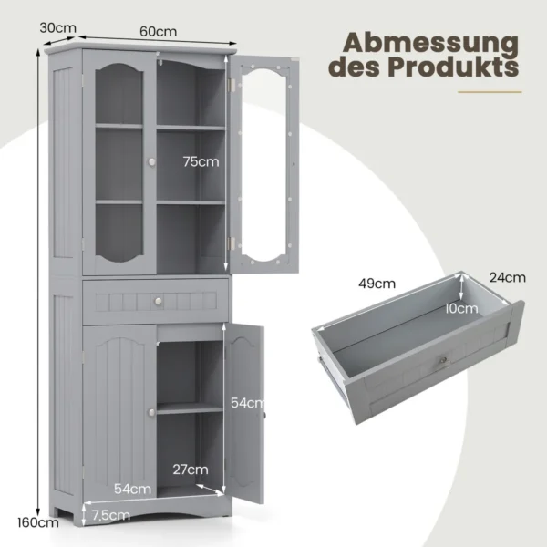 Vonios spintelė 60x30x160 cm pilkos spalvos puikiai tinka tvarkingam vonios kambario ar kitos namų erdvės organizavimui. Aukšta spintelė su grūdinto matinio stiklo durimis ir reguliuojamomis lentynomis suteikia patogias laikymo galimybes įvairiems vonios reikmenims, rankšluosčiams ir smulkiems buitiniams daiktams.