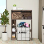 - Vonios spintelė su stumdomomis durimis, kurios leidžia taupyti erdvę ir apsaugo daiktus nuo dulkių.