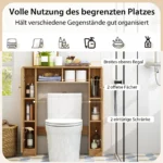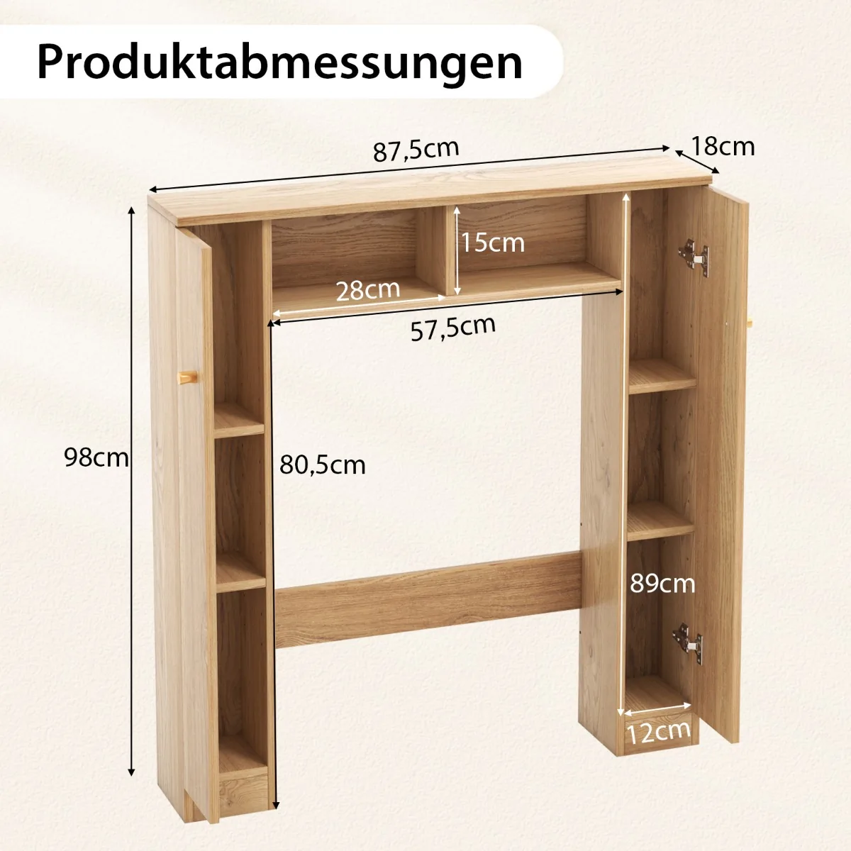 Vonios spintelė 87,5x18x98 cm šviesiai rudos spalvos – praktiškas sprendimas vonios kambario ar skalbyklos įrangos ir reikmenų laikymui. Kompaktiškas dydis leidžia efektyviai išnaudoti erdvę virš tualeto ar skalbimo mašinos, o reguliuojamos lentynos užtikrina patogų pritaikymą pagal poreikius.