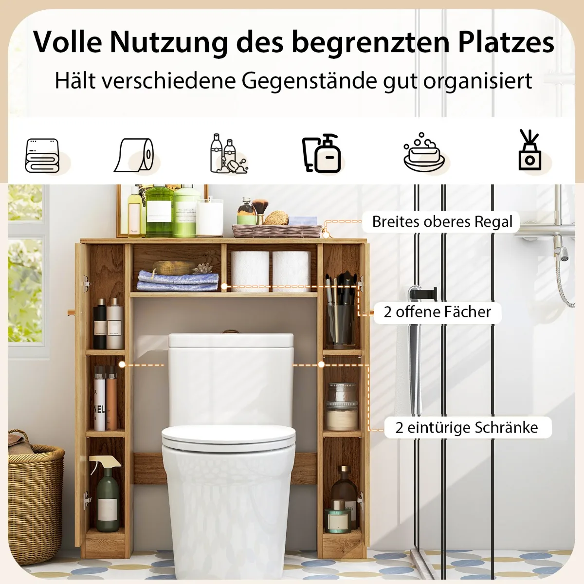 - Vieta taupantis dizainas tinkamas pastatyti virš standartinio tualeto ar skalbimo mašinos (laisvos vietos matmenys 57,5x18x80,5 cm).