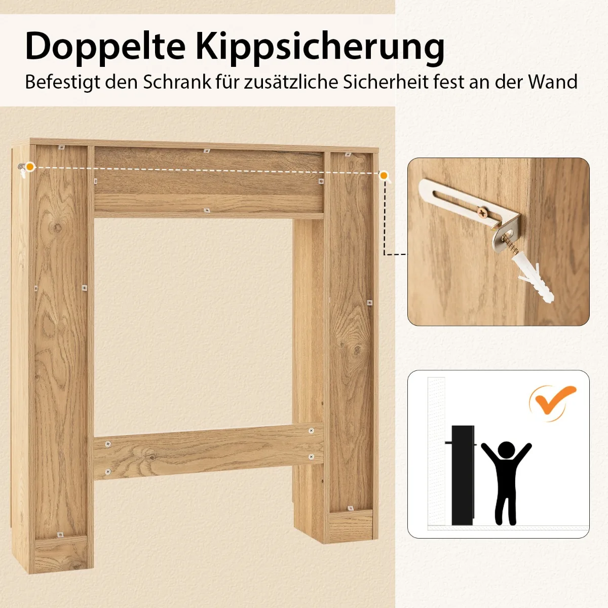 - Du apsaugos nuo apsivertimo įtaisai spintelės pritvirtinimui prie sienos.