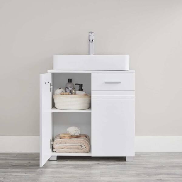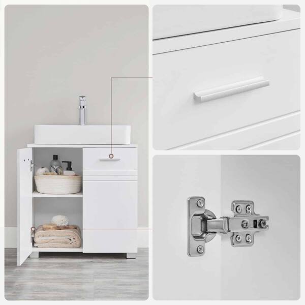 Ši vonios spintelė, baltos spalvos, yra puikus pasirinkimas jūsų vonios kambariui. Pagaminta iš aukštos kokybės medžio dulkių plokštė (MDF) (vidutinio tankio medienos plaušų plokštės) ir medžio drožlių plokštė (MDP) , ši spintelė yra ne tik estetiška, bet ir patvari.