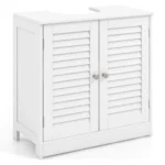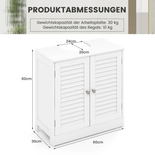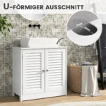 Vonios spintelė po kriaukle 60x30x60 cm – funkcionalus sprendimas mažiems vonios kambariams. Baltos spalvos spintelė su U formos išpjova leidžia patogiai pritvirtinti ją prie praustuvo ir efektyviai tvarkyti vonios reikmenis.
