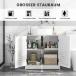 - Spintelė po kriaukle su dviem durelėmis ir vidine lentyna leidžia tvarkingai laikyti vonios reikmenis.