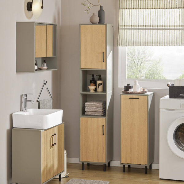 Ši vonios spintelė su skalbinių krepšeliu yra puikus sprendimas jūsų vonios kambariui. Jos pilkos ir šviesiai rudos spalvos dizainas suteikia elegancijos ir stiliaus jūsų interjerui, o išskleidžiama konstrukcija padeda paslėpti skalbinius ir užkirsti kelią kvapų plitimui, taip taupant vietą ir suteikiant patogią bei stilingą aplinką.