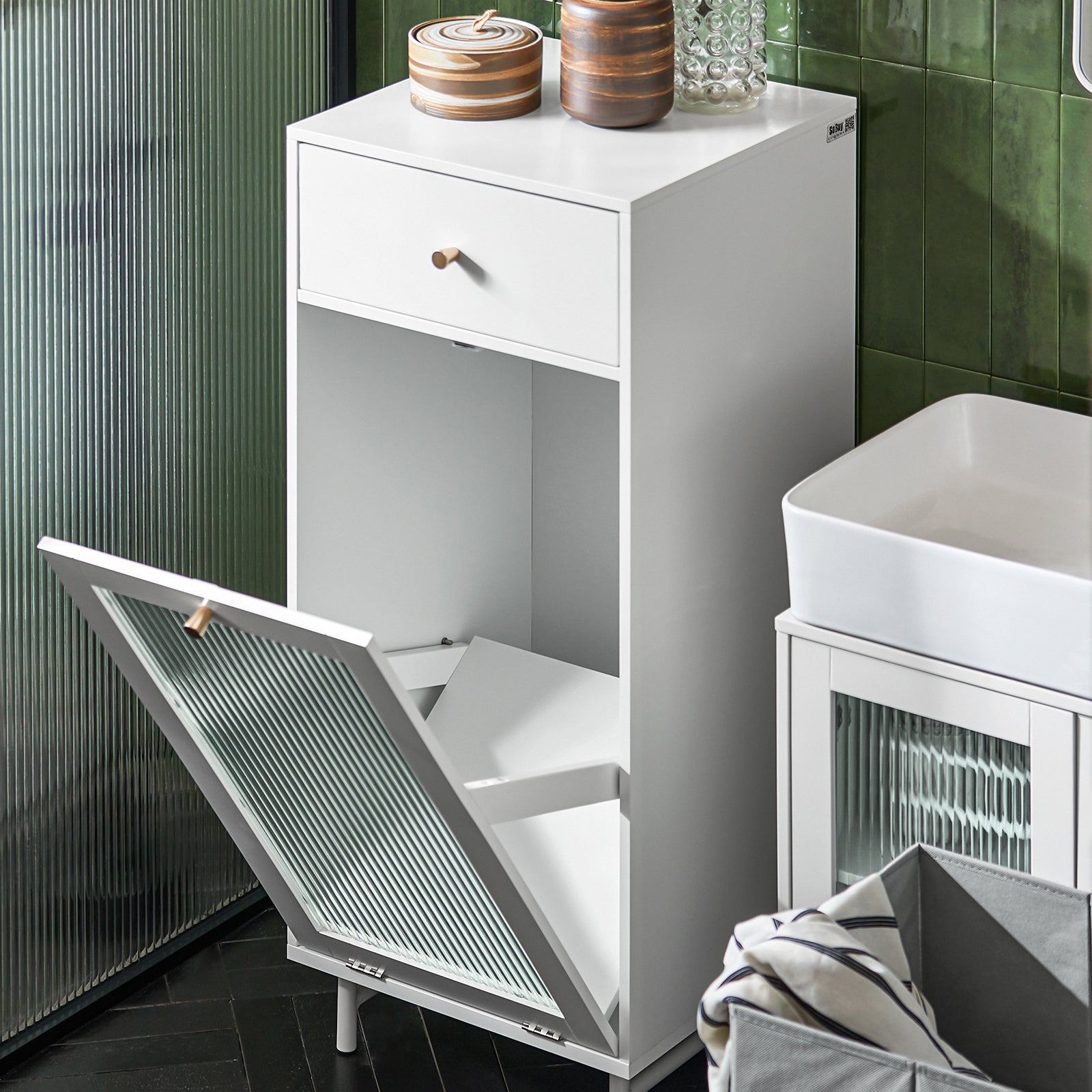 Komplekte yra dėžė ir spintelė su nuimamu skalbinių krepšiu, kuris leidžia efektyviai išnaudoti ribotą erdvę. Dėl siauro dizaino, ši spintelė puikiai tinka mažesnėms erdvėms ir padeda sutaupyti vietos.