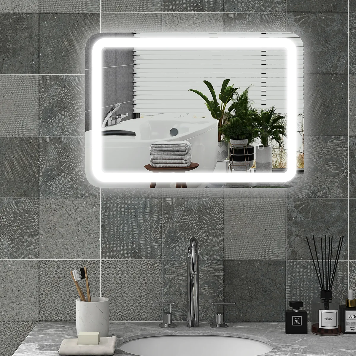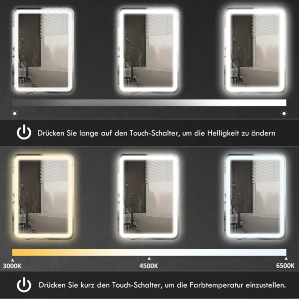 Su HOMCOM vonios veidrodžiu galite patobulinti vonios kambario dizainą ir palengvinti kasdienę grožio rutiną. Integruotas LED apšvietimas gali būti lengvai įjungiamas naudojant jutiklinį jungiklį, kuriame galite reguliuoti intensyvumą pagal pageidavimą ir išsaugoti pageidaujamą ryškumo lygį. Dėl apsaugos nuo rasojimo funkcijos unitazo veidrodėlis išlieka skaidrus net ir po ilgo karšto dušo, todėl nereikia valyti – puikus stiliaus ir funkcionalumo derinys!