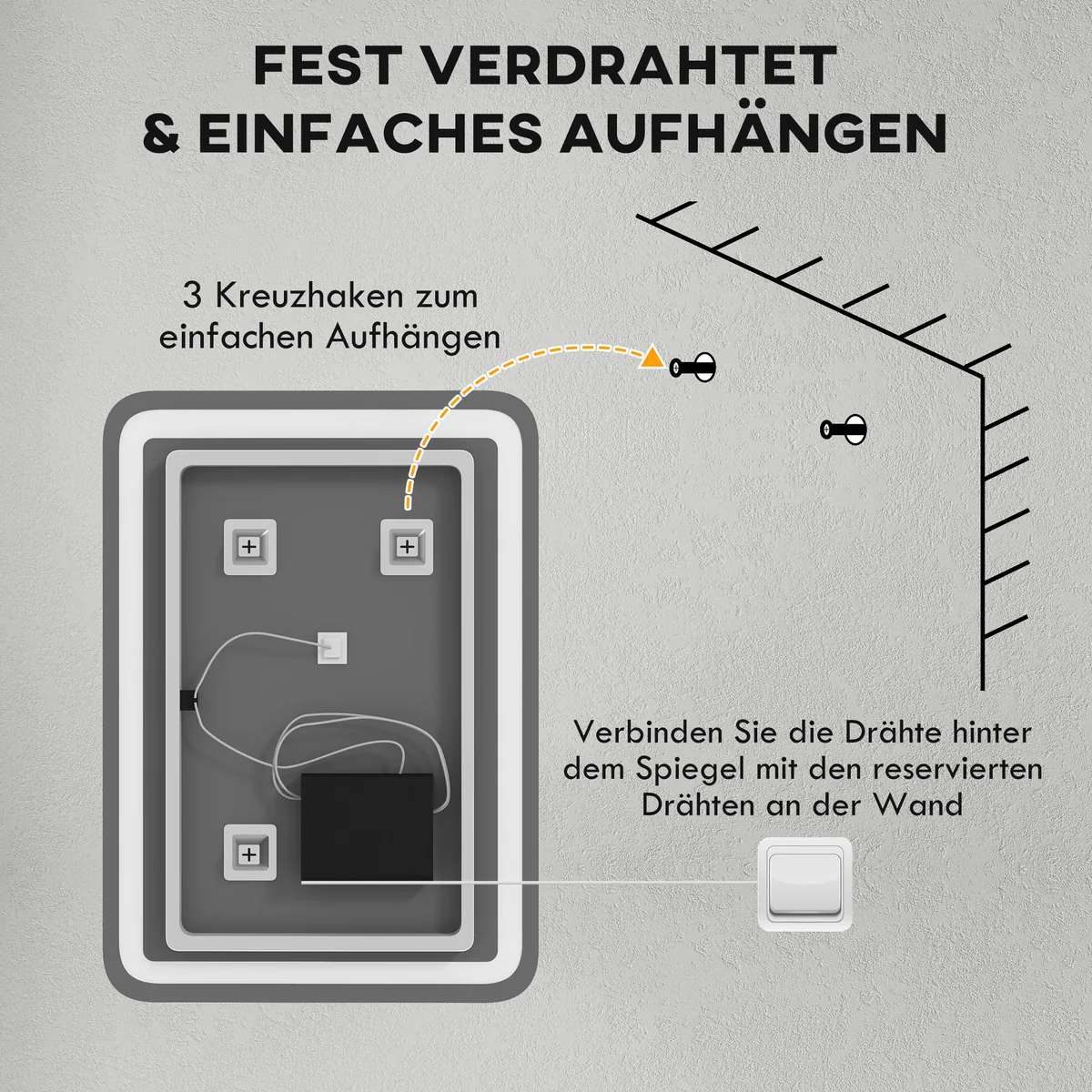 - ✔ Tvirtinimas prie sienos – LED vonios veidrodis gali būti montuojamas horizontaliai arba vertikaliai, kad būtų lankstesnis