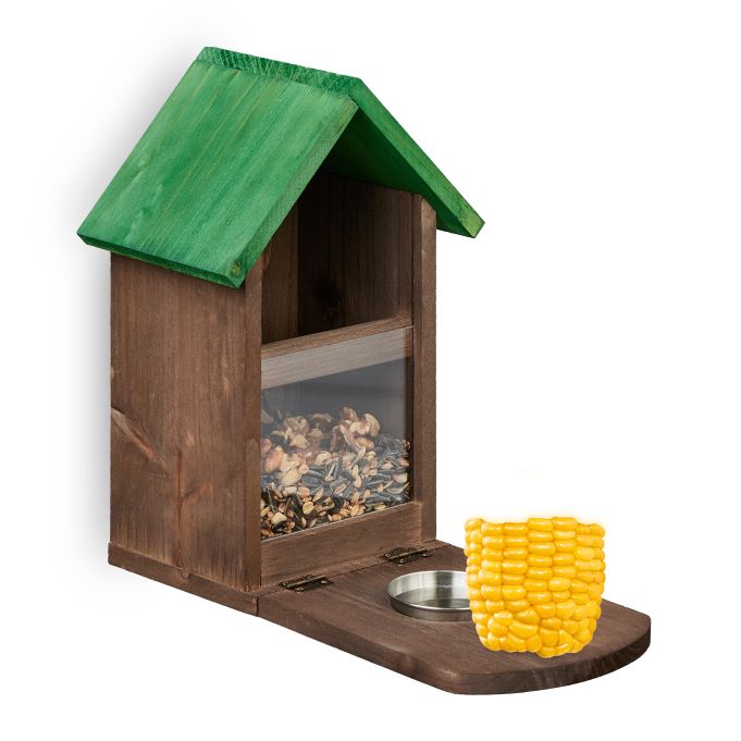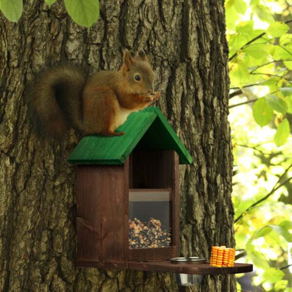 - Praktiškumas: Įrengta girdykla ir kukurūzų burbuolių laikiklis, kad voverės galėtų lengvai pasiekti maistą ir vandenį.