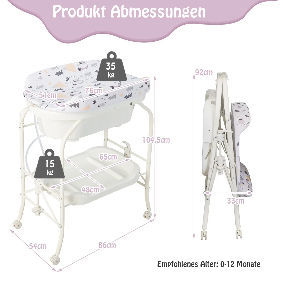 Vystymo stalas 86x54x104,5cm, baltos spalvos – praktiškas sprendimas kūdikių priežiūrai namuose. Universalus persirengimo stalas su vonia suteikia patogią vietą kūdikio vystyklų keitimui, maudymams bei reikmenų laikymui, o tinkamas aukštis padeda sumažinti nugaros apkrovą.