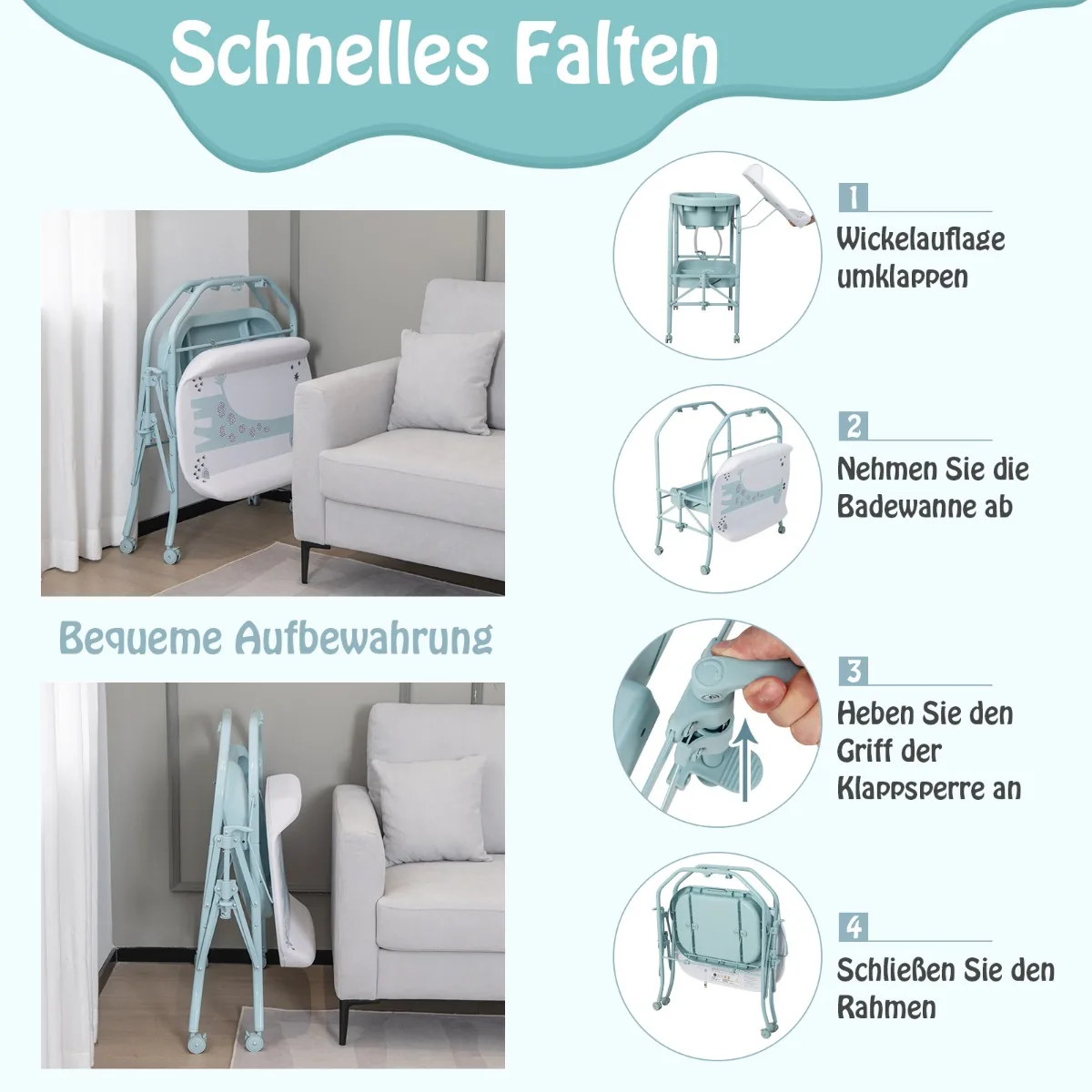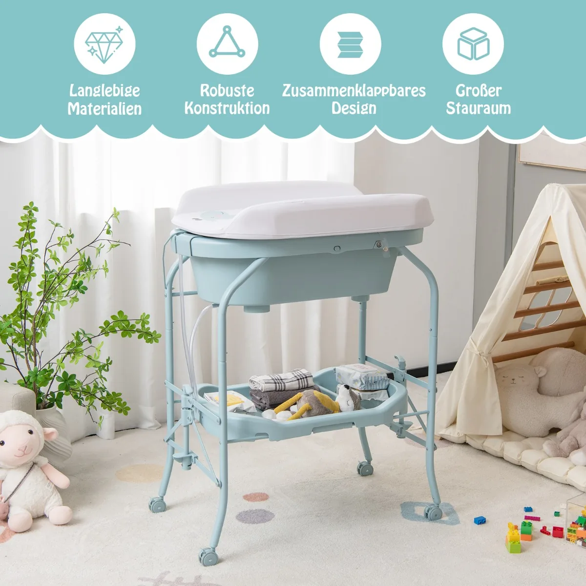 Vystymo stalas 86x54x104,5cm, mėlynos spalvos, skirtas kūdikių vystyklų keitimui ir maudymui. Universali persirengimo stotelė su vonia užtikrina patogumą ir saugumą kasdienėje kūdikio priežiūroje bei padeda apsaugoti nugarą.