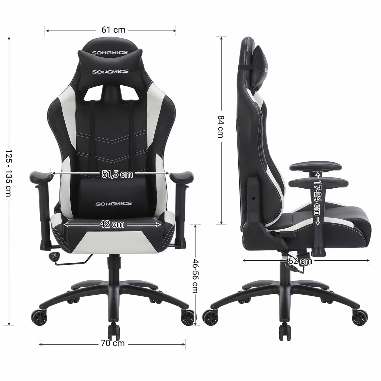- Dydis: Bendras aukštis: 125-135 cm, bendras plotis: 70,5 cm, bendras gylis: 69 cm, sėdynės aukštis: 46-56 cm, sėdynės plotis: 42-55 cm, sėdynės gylis: 52 cm, porankių aukštis (matuojant nuo sėdynės): 17-24 cm, atlošo aukštis: 84 cm, atlošo plotis: 61 cm, žvaigždės pagrindo skersmuo: 70 cm, volelio skersmuo: 65 mm, ašies skersmuo: 11 mm