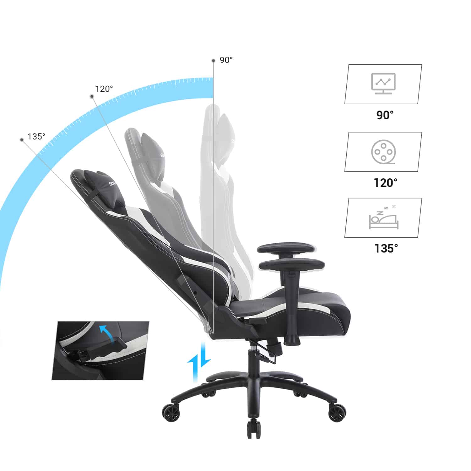 - Atlošo reguliavimas iki 135 laipsnių