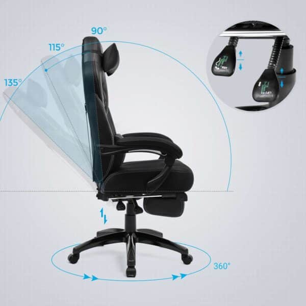 Jei nenorite žaisti, o tiesiog atsipalaiduoti ir žiūrėti filmą, galite reguliuoti atlošą nuo 90° iki 135° ir prailginti pėdų atramą – atsipalaiduokite patogiausioje padėtyje!