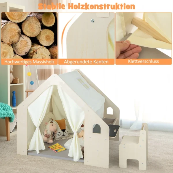Žaidimų palapinė 131x98x113cm šviesiai rudos spalvos – universali vidaus žaidimų namelio palapinė vaikams nuo 2 iki 6 metų. Komplekte yra žaidimų palapinė, grindų kilimėlis, stalas, kėdė, lenta ir laikymo dėžė, leidžianti vaikams kūrybiškai leisti laiką saugioje aplinkoje. Tvirta konstrukcija ir patogios detalės užtikrina ilgaamžiškumą bei komfortą.