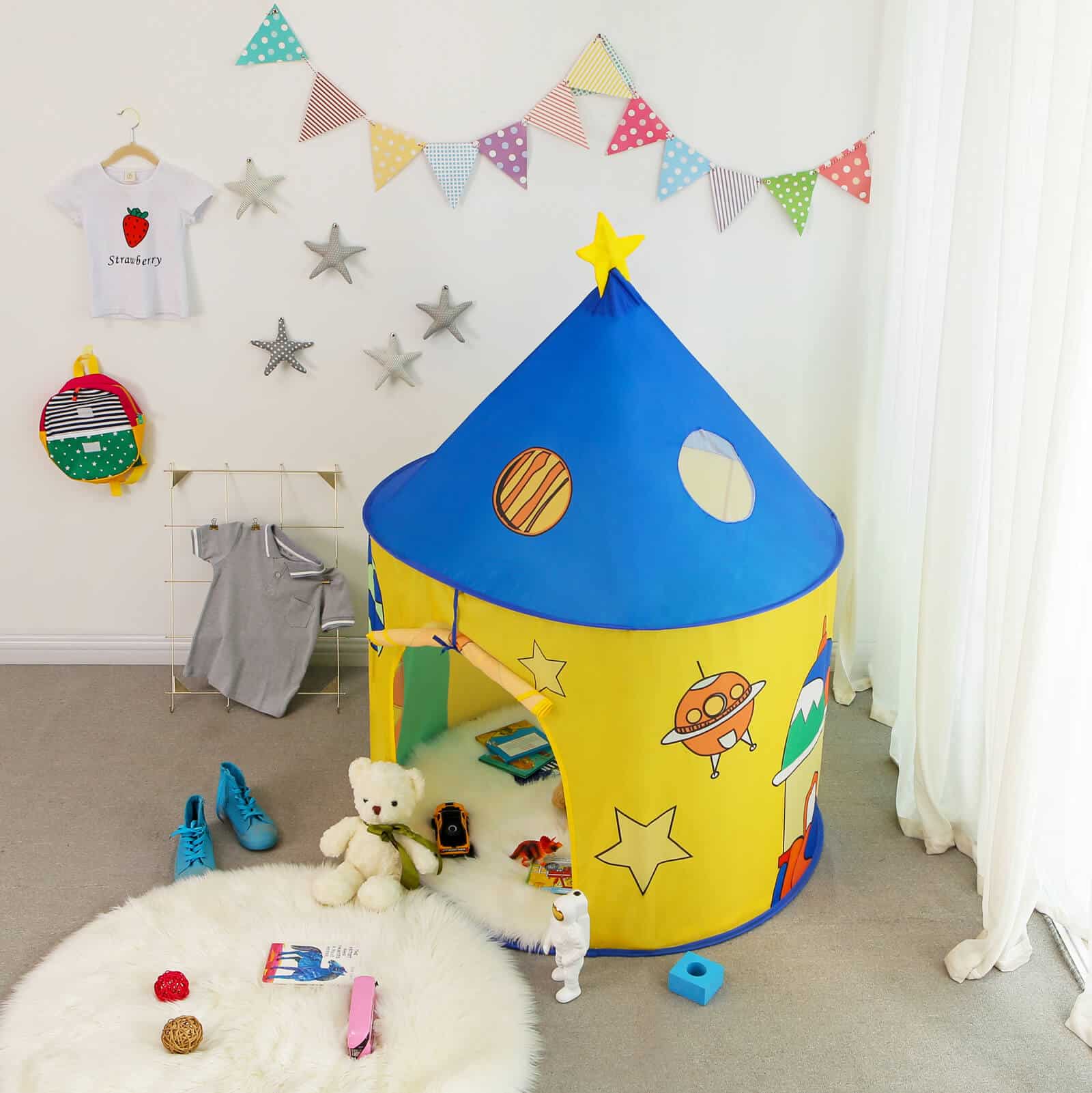 Palapinę galima pastatyti per kelias minutes: tiesiog išskleiskite ją ir įkiškite 4 stiklo pluošto stiebus. Tada galėsite tęsti savo kasdienes užduotis, o jūsų mažieji galės saugiai žaisti. Kai nenaudojate, sulankstykite ją į maišelį, kad būtų lengviau laikyti. Nelaukite ir nustebinkite savo vaikus šia miela dovana!