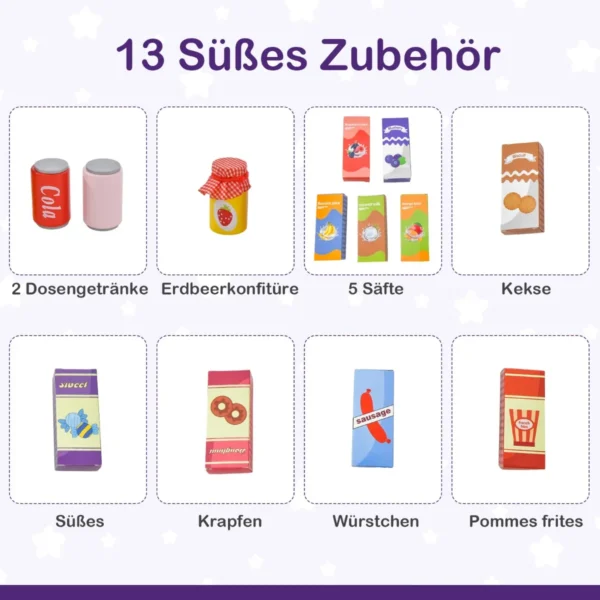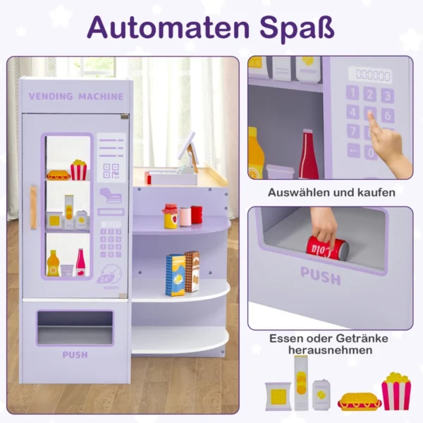 Žaislinė parduotuvė 89x57x80cm, violetinės spalvos, skirta vaikams nuo 3 iki 8 metų, padeda lavinti praktinius įgūdžius, kūrybiškumą ir rankų bei akių koordinaciją. Šis medinis bakalėjos žaislų rinkinys suteikia galimybę vaikams žaisti prekybos centro vaidmenis su kasos aparatu, pardavimo automatu ir saugojimo lentynomis.