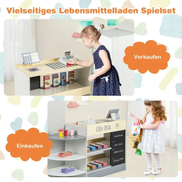 - Medinė žaislinė parduotuvė su suapvalintais kampais ir saugia konstrukcija, skirta vaikams nuo 3 iki 8 metų.