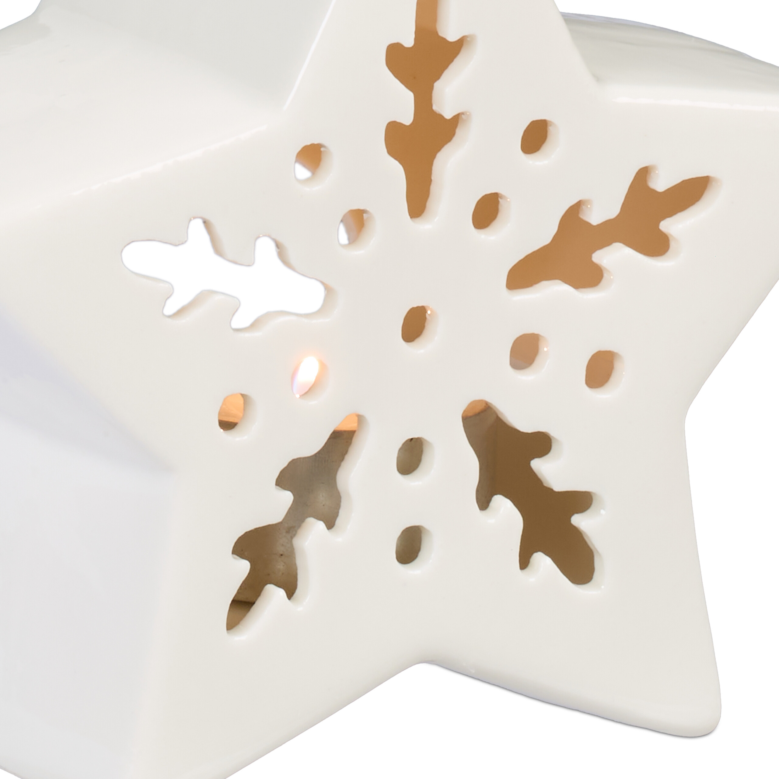 • Unikalus dizainas: Žvaigždės forma su subtiliais įdubimais, pro kuriuos prasiskverbia žvakių šviesa, sukuria jaukią ir šiltą atmosferą.
